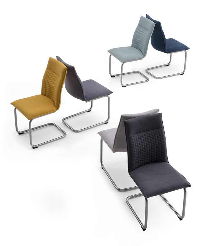A special highlight is the quilting in a honeycomb pattern, which is emphasized by beige yarn. The design is rounded off by a chrome-colored metal frame in a C-shape.
